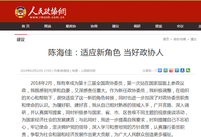 人民政协网丨陈海佳:适应新角色 当好政协人