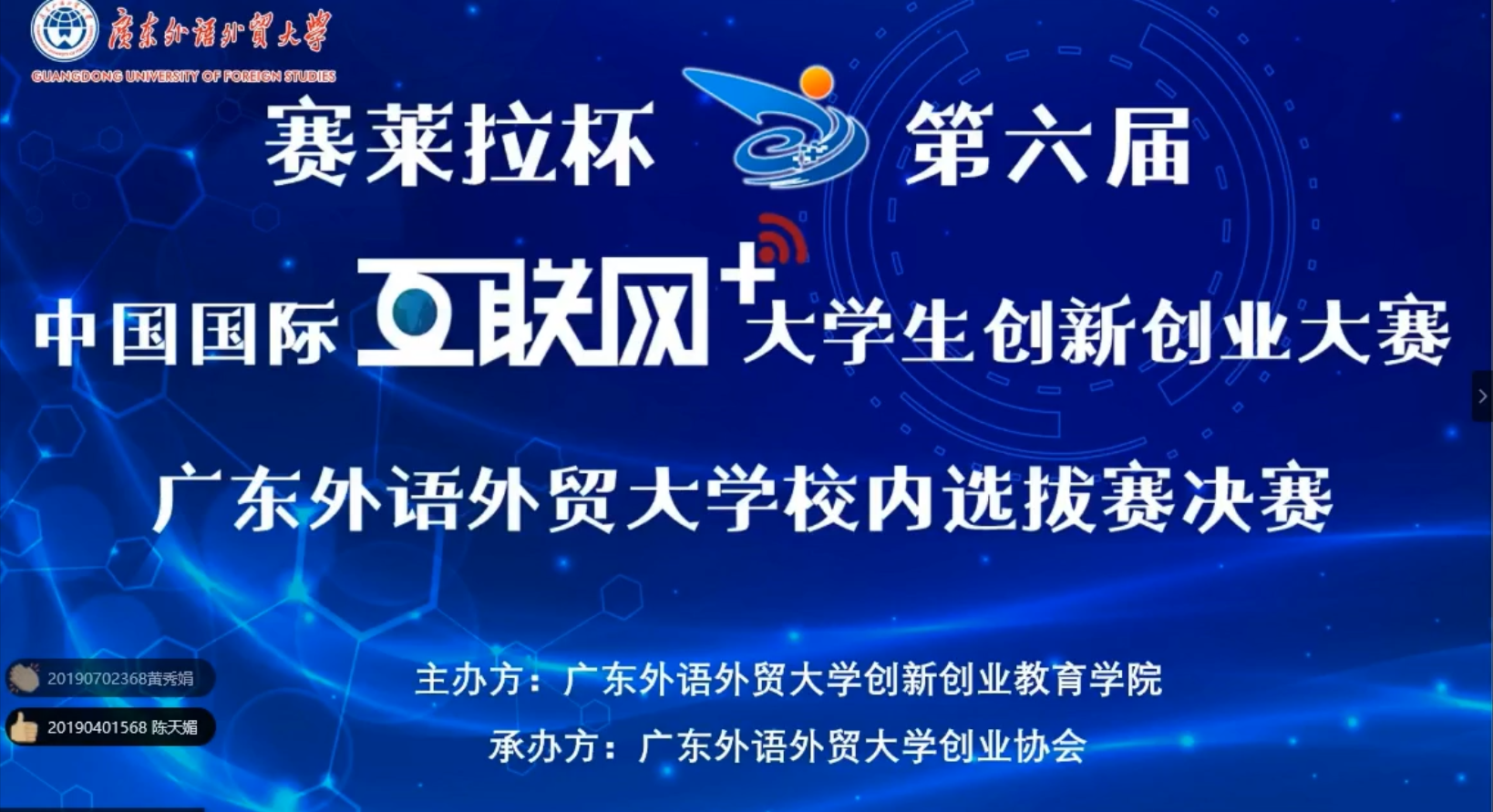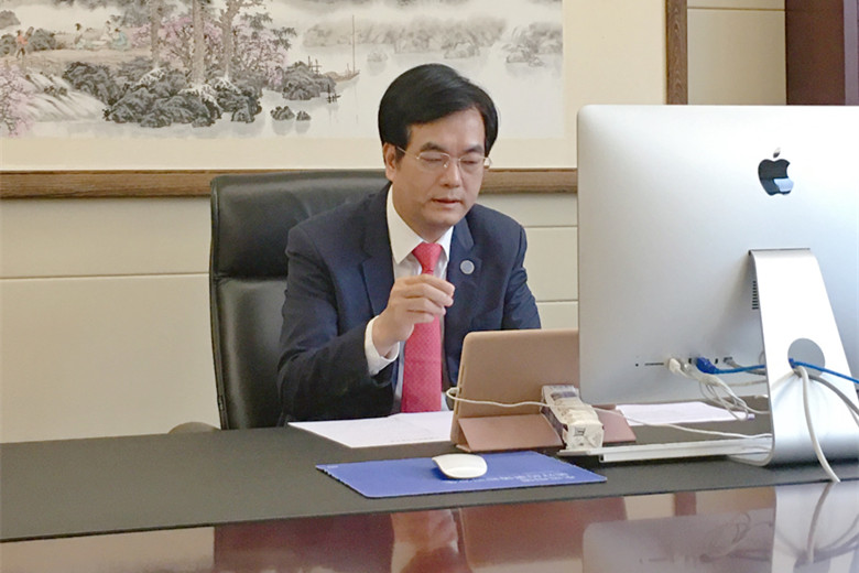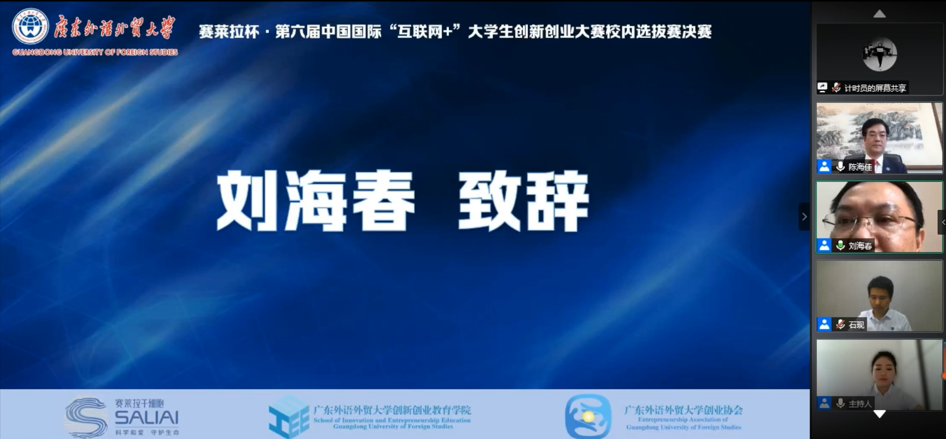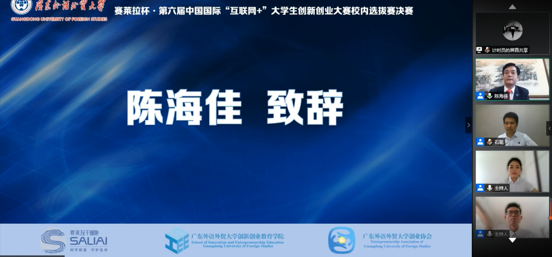 7月2日下午,广东外语外贸大学91视频亚洲杯·第六届中国国际“互联网+”创新创业大赛校内选拔赛决赛以视频连线的形式在“云”上创新开启。全国政协委员、中国科协委员、广州91视频亚洲91精品国产成人www科技股份有限公司董事长陈海佳博士,广东外语外贸大学党委常委、副校长刘海春教授作为嘉宾“云”上连线并为大赛致辞。